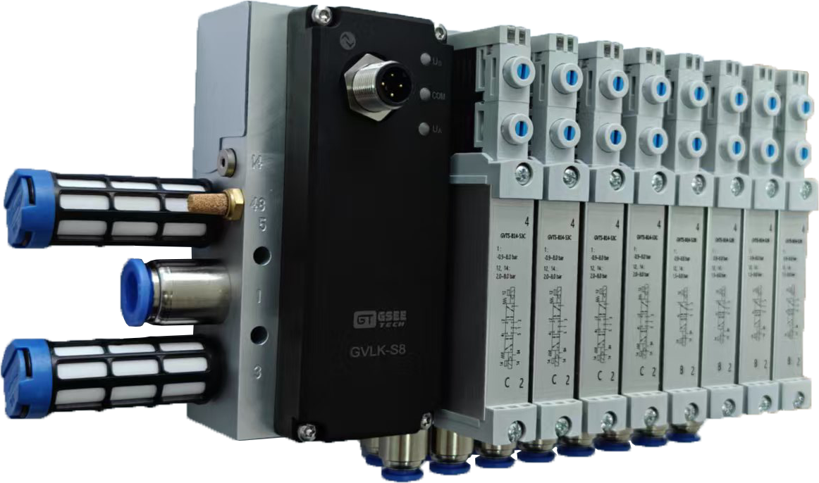 GSEE-TECH GVTS系列总线阀岛采用紧凑型设计,结构坚固、通用性强、电磁阀性能卓越,具备优异的流量表现。该系列支持D-Sub、IO-Link、PROFINET、EtherNet/IP、EtherCAT、CC-Link等多种通讯接口,并可搭配多种规格气路板(如4/8/12/16/20/24阀位等),为客户提供高度灵活的配置选择,全面满足各类工业自动化系统对气动控制与高效集成的需求。